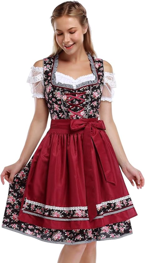 Kojooin Traditional Women S Dirndl Dress Short Midi 3 Pcs For Oktoberfest Three Pieces Dress Blouse And Apron Amazon De Fashion